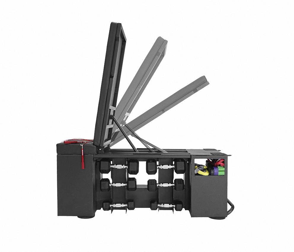 - Espacio de almacenamiento para 6 pares de mancuernas, con agujeros para kettlebells y slam balls.