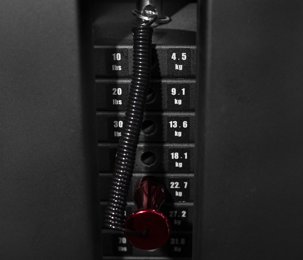 - Selectores de placas magnetizados. Los imanes evitan que el selector se salga durante el ejercicio.